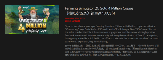 据Giants Software官方消息,本作在全球范围内的销量已经突破400万份!Giants Software首席营收官兼发行部门主管Boris Stefan表示:“这太令人惊喜了。真正让我们兴奋的并不是销量本身,而是第一年结束后,我们从社区收获到的巨大参与度和压倒性正面反馈。”他在办公室敲响了一口真·船钟,以庆祝最新的渔业主题DLC“Highlands Fishing”的成功上线。