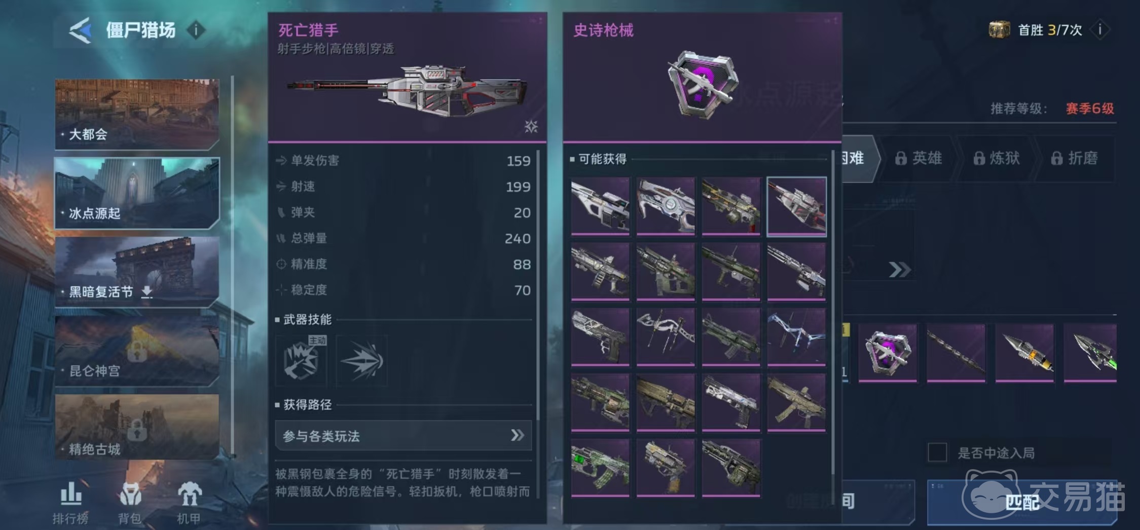 死神猎手为传说品质武器,定位为高阶远程狙击单位。获取方式有两种:一是消耗传说枪械币兑换专属蓝图后进行锻造;二是通过参与高难度副本或赛季活动获取钛金密藏,开启后有一定概率直接获得。死亡猎手则为紫色传说品质,获取门槛相对更低——主要通过日常玩法、挑战关卡及团队副本稳定掉落碎片,集齐后可合成完整武器;同时亦有概率从钛金密藏中随机开出。综合掉落率与资源投入成本,死亡猎手是当前多数玩家优先入手并长期使用的主力射手步枪。