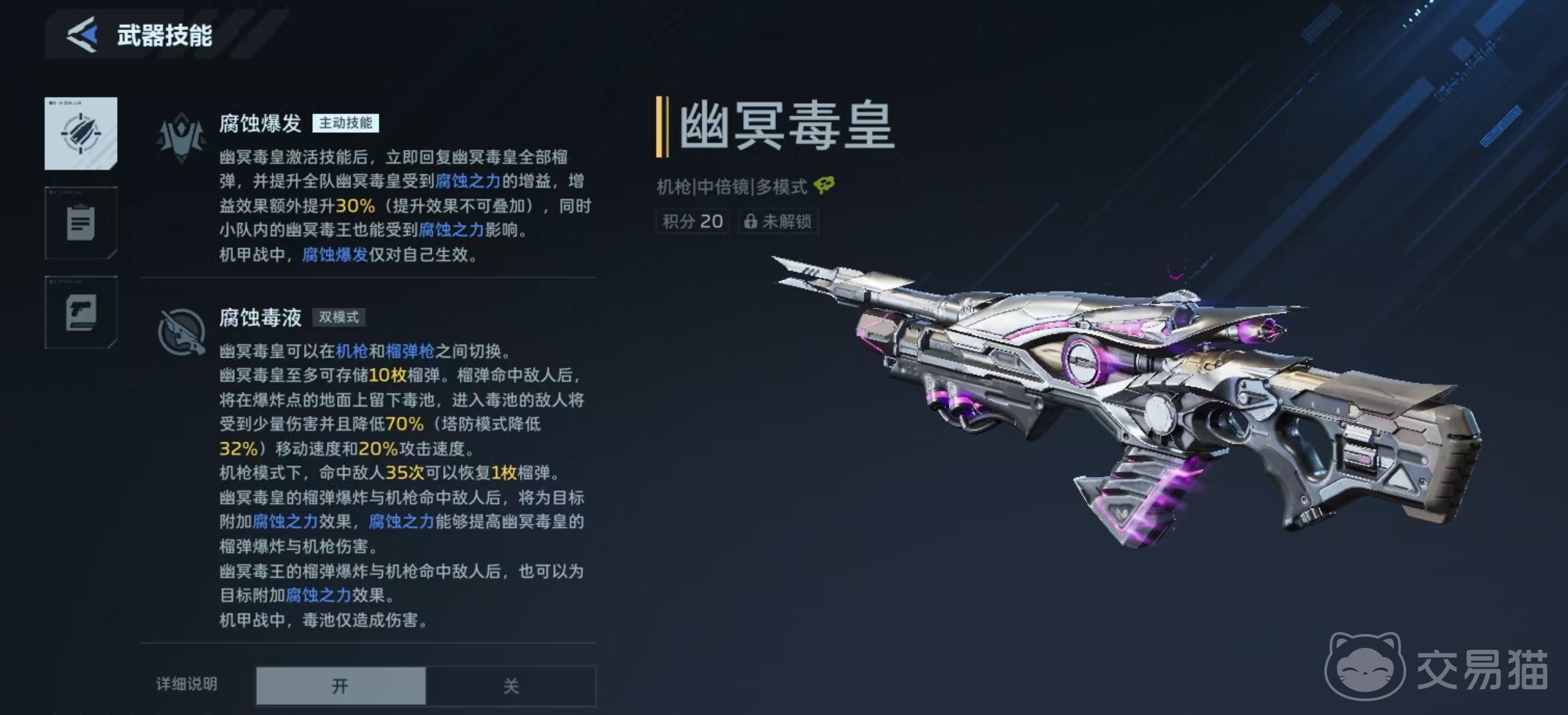 此外,幽冥毒皇搭载主动技能“腐蚀爆发”,激活后立即补满全部10枚榴弹储备。该技能不仅解决续航问题,还联动武器基础机制——无论是榴弹爆炸还是机枪子弹命中,均会为目标施加“腐蚀之力”状态,进一步提升后续爆炸伤害与机枪基础伤害。多重机制协同运作,使该武器在长时间高强度战斗中始终保持高输出密度与战术灵活性。