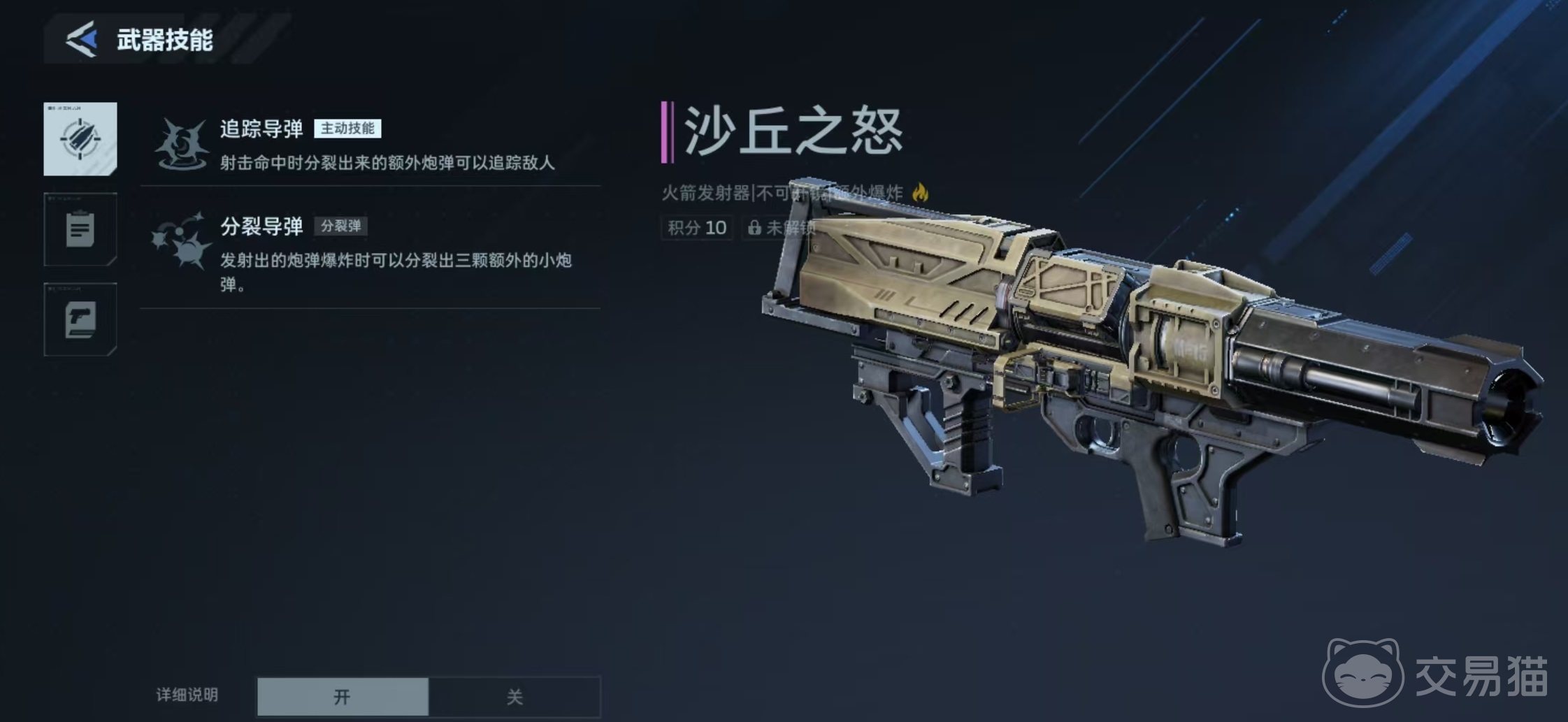 基础属性方面,沙丘之怒单发伤害为143点,射速85,弹匣容量4发,总携弹量36发,爆炸半径1.0米。技能系统包含两项核心机制:主动技能“追踪导弹”,在命中目标后分裂出额外弹体自动追击附近敌人;被动技能“分裂导弹”,使主弹爆炸时再生成三枚小型追踪弹,进一步扩大覆盖区域。双重分裂机制使其在应对集群敌人时具备极强的AOE清场能力。