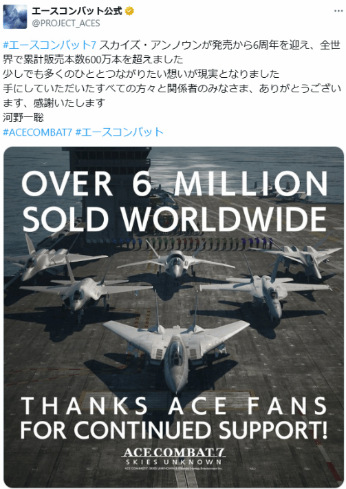 近日游戏厂商万代南梦宫在社交媒体上发推庆祝旗下《皇牌空战7:未知空域》全球总销量突破600万。