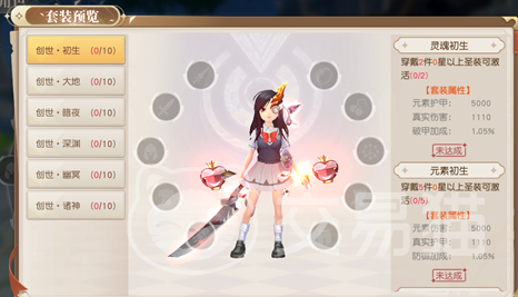 套装效果是时装系统的核心策略维度。当前已开放初生、大地、暗夜、深渊、幽冥五大主题系列。每套时装均按穿戴数量分层激活效果:穿戴2件及以上可触发基础套装属性,如“初生”系列即提供元素护甲、破甲加成及真实伤害;穿戴5件可激活进阶效果,包括真实护甲、防御力提升与元素伤害增幅;当集齐10件(含全部5部位各2星及以上)时,将解锁终极套装属性,实现战力的结构性跃升。