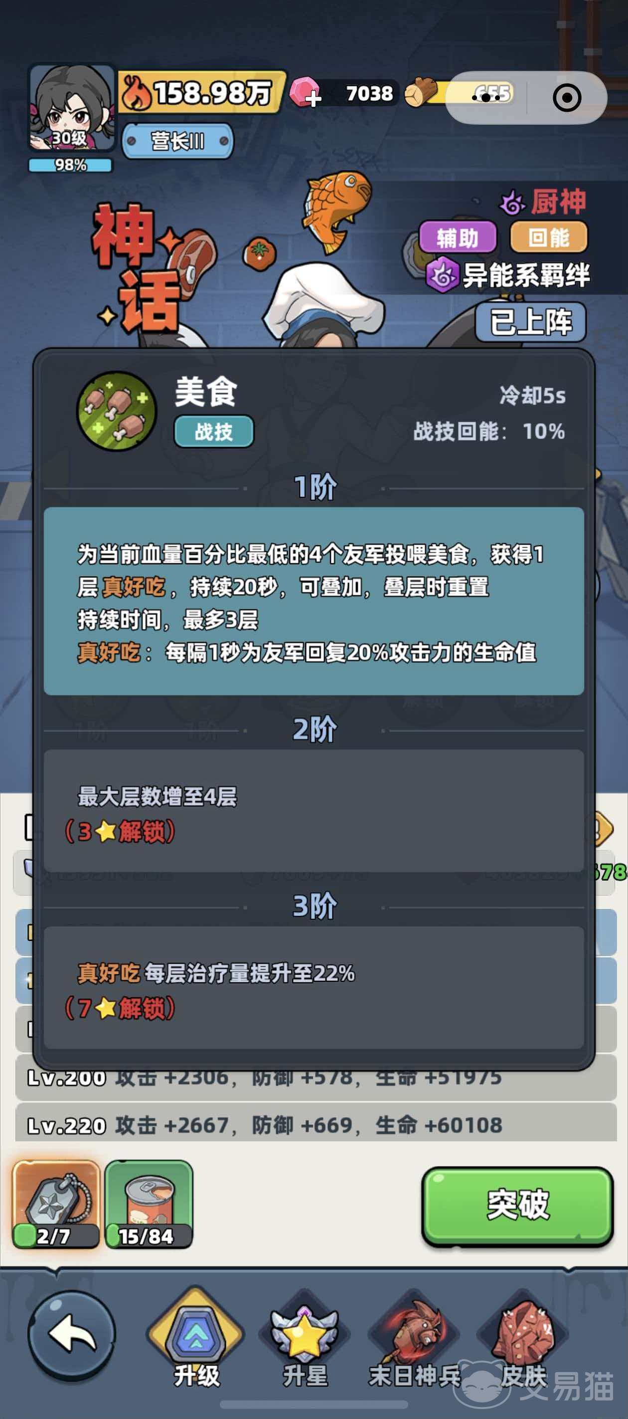 厨神属于神话品阶辅助型英雄,核心机制围绕“能量回复”与“生存强化”展开。登场后可降低自身所受伤害,并提升生命上限百分比。需注意其异能系羁绊触发条件:必须搭配其他异能系英雄,方能激活对应羁绊效果,因此组队时建议优先构建异能体系。