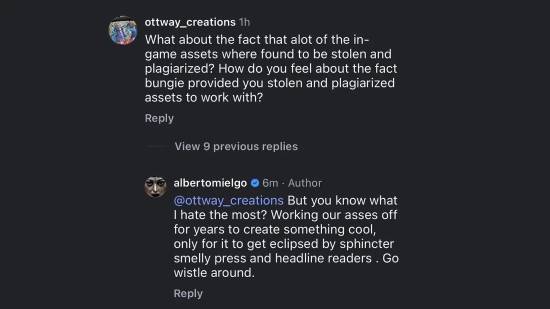 在这条回复中,Alberto Mielgo更深入地表达了自己的观点。他指责这名评论者想借机挑起争议,把对方称作“举报人、真理探索者”。他说对方搞错了、被误导了,按照他的理解,Bungie当时只不过是误用了一个贴图,而且那个贴图主要是一些“拼写错误和文字,全都淹没在庞大而复杂的工作流程里”。