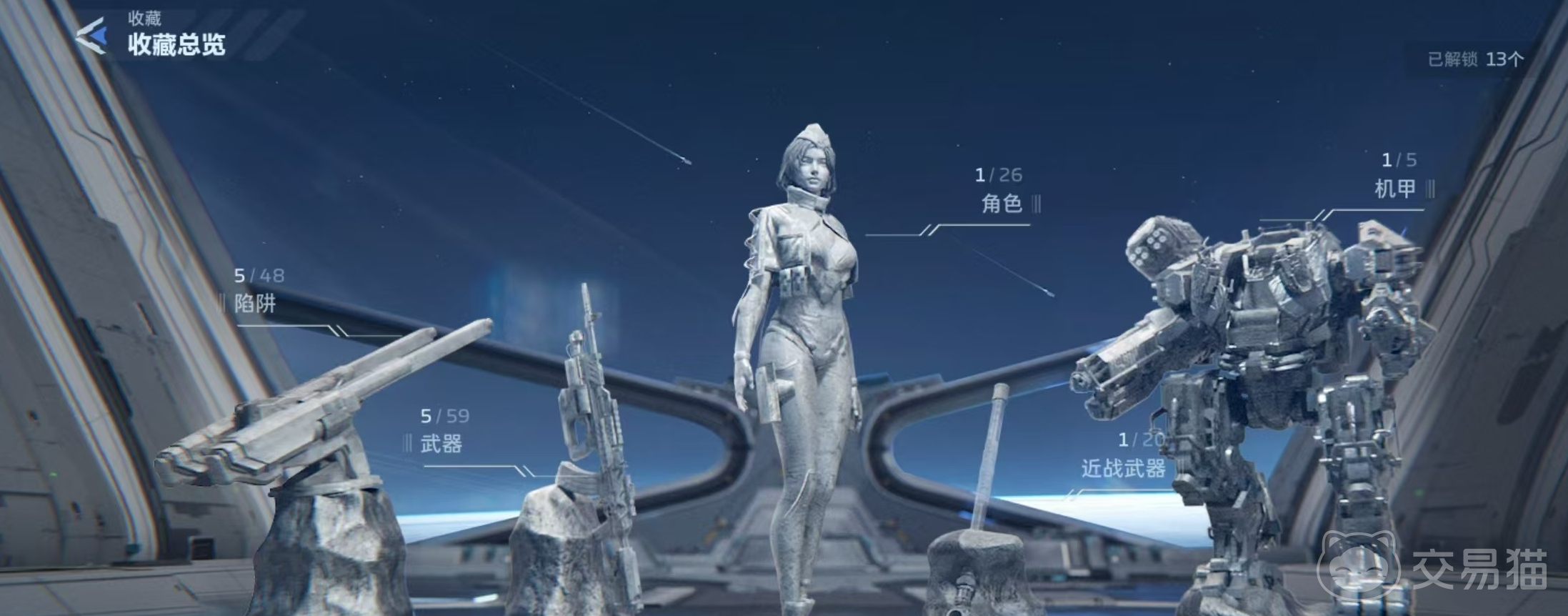 收藏系统位于游戏主界面大厅的左下角区域,点击“收藏”按钮即可进入。界面中实时显示当前收藏家等级、总积分、已收集物资数量等核心数据,涵盖角色、主武器、陷阱装置、近战武器、机甲等多个分类条目。
