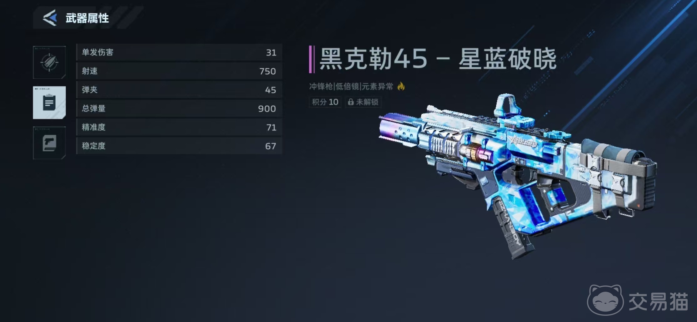 黑克勒45是《逆战:未来》中玩家初入游戏时默认配备的经典冲锋枪,凭借易上手的操作逻辑与稳定的输出表现,长期占据新手过渡阶段的主力位置。在基础型号基础上,官方陆续推出了多款主题皮肤,其中“星蓝破晓”作为高人气定制版本,以冷峻科技感的蓝色光效涂装与流线型结构设计脱颖而出,兼具视觉辨识度与收藏价值。