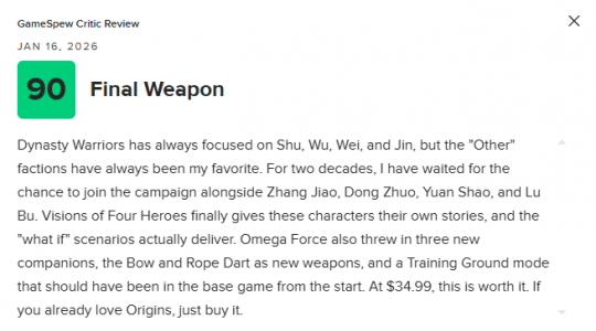 尽管部分设计选择与本体的系统衔接感略显割裂,但出色的叙事深度和玩法层面的提升,仍然让这部DLC成为2026年最亮眼的无双类体验之一。