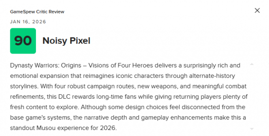 《真三国无双:起源》的大型DLC“梦幻四英杰”将于1月22日正式发售。近日,该DLC的媒体评分也已解禁。截至目前,“梦幻四英杰”M站媒体均分为82分,共收录7家媒体。