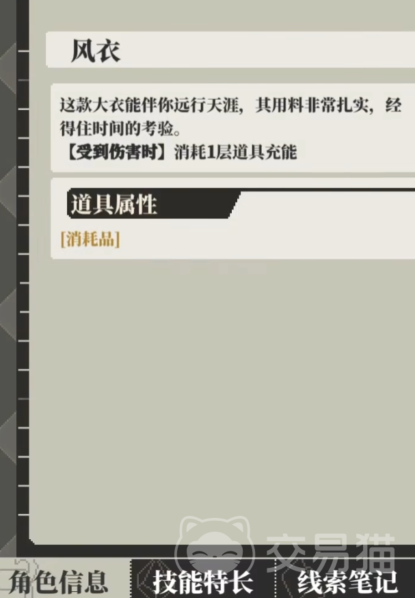 界面中部为装备管理区,涵盖主武器、副手装备及已激活道具。右侧为道具库入口,点击后可查看道具详情,包括名称、效果说明与使用限制。例如风衣类道具可提升道具使用频率,但属一次性消耗品,需及时补充库存以维持连续作战能力;饮料类提供临时增益,喷火器则具备环境交互功能,可用于清除障碍物或压制特定敌人类型。