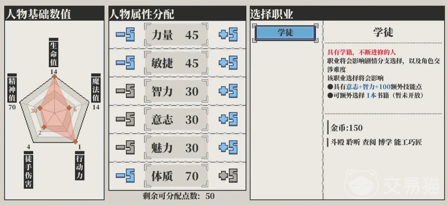 初始属性分配在创建角色时完成,后续调整需依赖游戏内限定道具或特殊机制。建议前期优先投入力量、敏捷与体质三项,兼顾输出、机动与生存,形成稳健发育节奏。职业初始仅开放学徒路径,转职需完成指定剧情任务并满足属性门槛,不可提前变更。