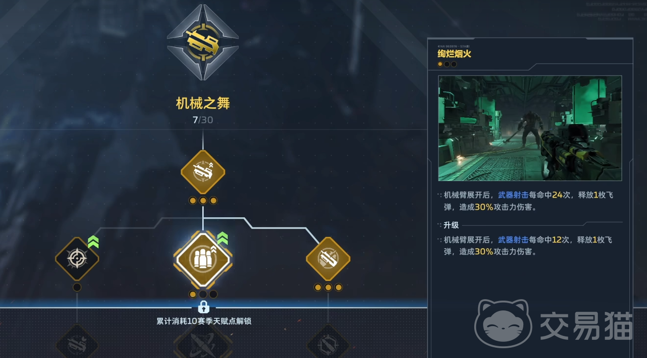 在机械之舞体系中,关键天赋如“绚烂烟火”与“死神时刻”均围绕高频命中触发机制设计:“绚烂烟火”达成24次命中后释放飞弹造成额外伤害;“死神时刻”则在武器累计攻击敌人达8次后自动发射一枚追踪导弹。此类被动效果不依赖手动释放,可持续为单体目标施加压力,契合Boss战中追求稳定DPS的需求。