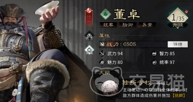 董卓:高资源投入型进攻向坦克。获取周期长、升星成本高,但机制强度突出。天赋“独断专权”兼具强控与压制:发动时夺取敌我双方全体统帅值,对敌方三人造成伤害并施加挑衅,同时削弱目标属性。当二级天赋解锁后,被挑衅单位对其发起攻击时,董卓有概率触发反击,并附加易伤效果,进一步放大队伍整体输出效率。推荐阵容为诸葛亮(功能衔接)、董卓(前排压制)、贾诩(持续伤害 干扰),前排可配置藤甲兵增强生存,后排搭配五斗米祭提升策略续航,适用于追求高爆发与高控场的进阶场景。