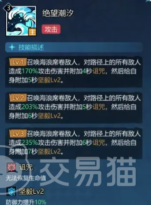 其核心竞争力源于以“禁疗”为核心的技能体系。“绝望潮汐”是爱丽儿的核心输出兼控制技:向前方直线召唤巨浪,对路径上所有敌人造成群体伤害,并附加诅咒效果。该技能基础伤害为170%,满级提升至235%;诅咒持续时间由初始4秒增至6秒,期间目标无法恢复生命值,有效瓦解敌方续航体系。同时,施放该技能还将为自身赋予“坚毅”状态,提升防御力,最高持续7秒。另一主动技能“深海之怒”则进一步强化其战场生存与压制能力。