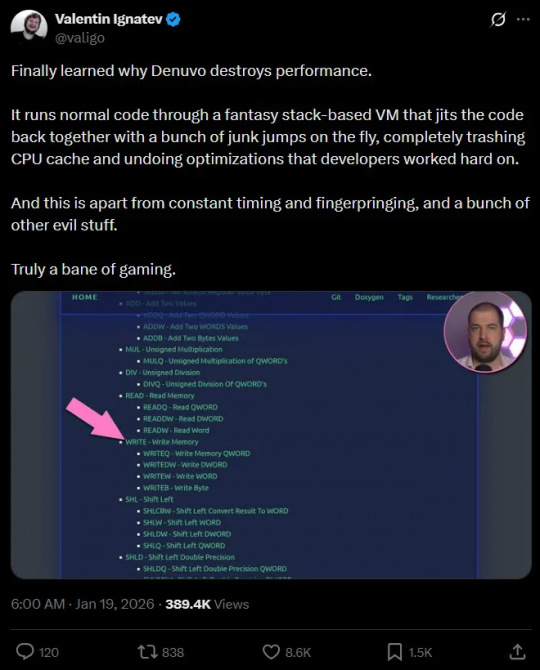根据博主Nathan Baggs的分析以及程序员@valigo在社交媒体上的佐证,Denuvo的核心工作原理是:它将游戏的部分关键代码包裹在一个自定义的虚拟机中。原本为CPU高效执行而优化编译的指令,会被转换为此虚拟机特有的指令集。