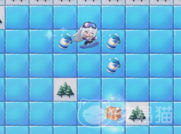 宝箱开启后,角色需返回初始点位,开启最开始路过的第一个宝箱。随后向下移动获取第三把钥匙,再横向收集右侧全部牛奶。进入**滑冰区域后,优先拾取下方所有牛奶,再靠近宝箱旁的史莱姆并将其踢离,最后沿安全路径抵达终点。