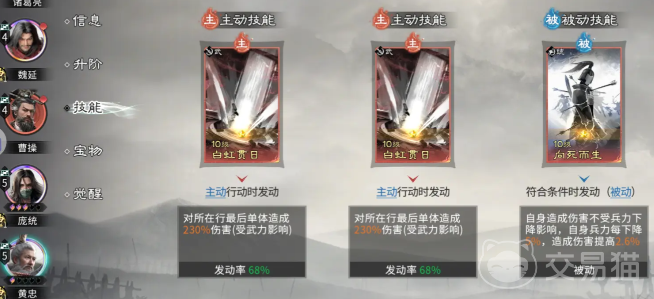 黄忠技能推荐“白虹贯日”与“向死而生”,前者强化单体破防能力,后者适配低血量环境下的爆发增幅逻辑,后期可替换为双主动技能卡以进一步放大瞬时输出。孙权则建议携带“临危不乱”与“鼎立相助”——前者确保控制抗性,防止关键回合被沉默或禁疗;后者可定向为智力最高者(庞统)与武力最高者(黄忠)同步提供兵力回复,并与庞统连环技形成联动,叠加额外伤害增益。