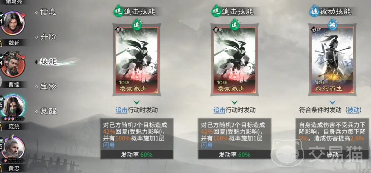 技能搭配层面,庞统应优先选择“凌波微步”与“相思而生”两张技能卡。前者赋予闪避能力,提升生存阈值;后者支持主动技向追击技转化,配合双追击类技能卡可显著提高追击频次与容错空间。被动效果亦能规避兵力衰减惩罚,保障属性成长曲线稳定延续。