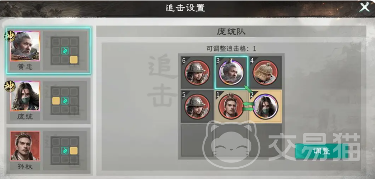 孙权的辅助价值不仅体现在常规增益上,更在于其重生机制对庞统续航的强力支撑——当庞统阵亡后可立即复活并进入觉醒状态,获得15%全伤害提升与20点智力加成,且可再次释放连环计。这一循环设计使庞统在中后期拥有持续爆发潜力。阵容配置方面,后排需部署两名双穿透型弓兵以补足物理端输出缺口;站位安排上,黄忠无需占据追击格,而庞统须精准踩踏孙权所处的追击格,同时利用自身位置触发黄忠的追击响应,从而最大化三次技能释放节奏中的追击次数密度。