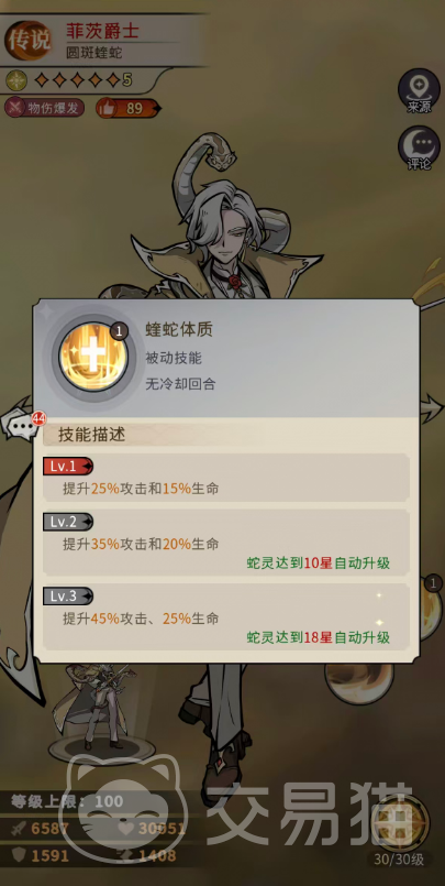 被动天赋【蝰蛇体质】提供阶梯式属性强化:基础形态增加25%攻击与15%生命;10星解锁后提升至35%攻击与20%生命;18星完全激活时可达45%攻击与25%生命加成。该被动不仅直接放大所有技能的基础伤害,还根据菲茨爵士当前生命百分比动态调节作战效能——在不同血量区间分别提供最高20%伤害增幅与10%减伤效果;当处于后排位置时,额外获得10%暴击率与20%暴击伤害提升。星级差异直接影响其战场适应性与容错空间。