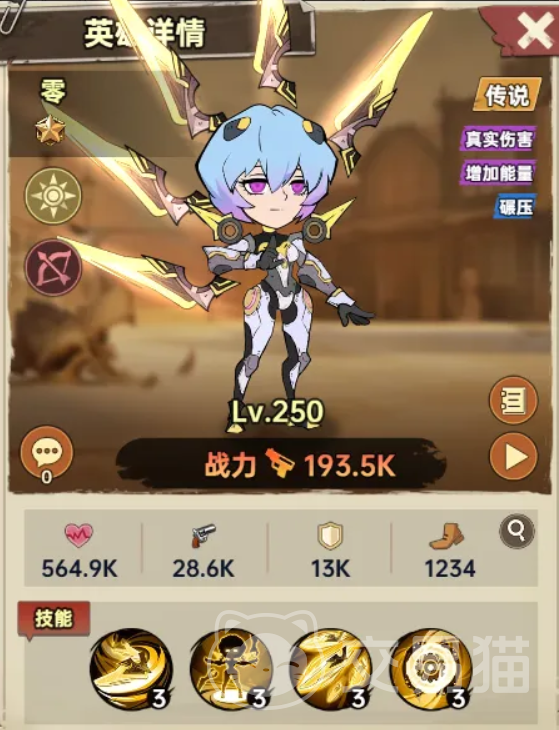 【束缚装甲】为增益型主动技能,生效后提升零70%真实伤害、32%暴击率、60%速度及50%攻击精准度,并赋予免疫眩晕状态,大幅增强其生存稳定性与输出容错率。【磨锋之刃】则优化普攻逻辑:此后三回合内,零每次普通攻击将自动锁定敌方血量最低单位,造成208%攻击力伤害,同时吸收目标30%攻击力,且100%概率恢复自身50%最大生命值。【暴走模式】提供战斗中后期关键续航——每当有敌方单位退场,零立即回复最高30%最大生命值、获得100点能量,并永久提升32%真实伤害,该增益持续至本场战斗结束。