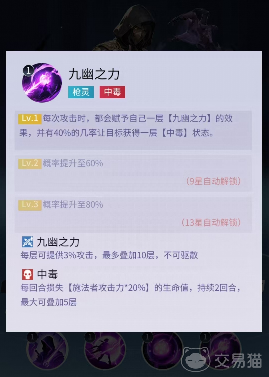三技能提供基础属性增益,提升自身攻击力、最大生命值及暴击伤害;终极技能“九幽之力”则具备持续成长特性:每次普通攻击均可叠加1层效果,每层提供3%攻击力加成,上限为10层;同时有概率使目标陷入中毒状态,每回合持续损失生命值。该技能显著强化阎罗王中后期的输出稳定性与压制持久性。