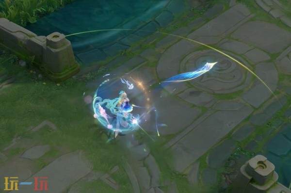 三技能:王昭君召唤出一片梦幻海域,边缘缭绕被晨光浸染的金色云朵;云朵间浮现水母竖琴,琴弦自动奏响,召唤两只飞鱼环绕海域遨游;随后鲸鱼幻影从海域中腾空跃起,其间贝壳、海螺与记忆碎片不断洒落;每一碎片击中地面时,都会唤醒一只发光的小灯塔水母,在海域内轻盈浮动。