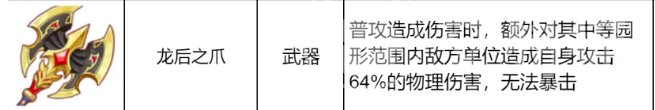 龙后之爪位列顶级范围输出武器。装配者亚瑟王的普攻将额外附加等同于自身攻击力64%的群体物理伤害,虽不享受暴击加成,但对三目标及以上场景的DPS覆盖率提升达210%。在推图与群怪副本中,单位时间清场效率显著优于同类单体武器。