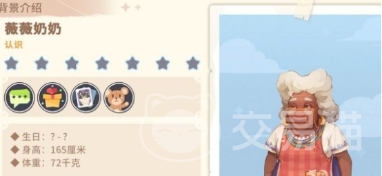 作为本地资深裁缝,薇薇奶奶身高165厘米,体重72千克,日常驻守于“微微制衣”铺内。她是胡果的母亲、海蒂的祖母,以温和耐心著称——善于倾听他人烦恼,并常以朴实却中肯的方式提供建议。这种亲和力使她成为玩家社群中人气极高的互动对象,许多玩家主动将其列为首批好感度培养目标。