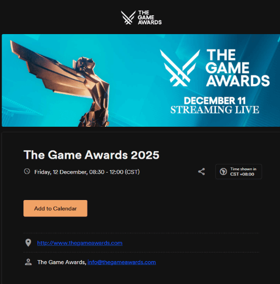 2025年The Game Awards(TGA)年度游戏大奖将于北京时间12月12日(星期五)8:30正式举行,预计将持续至12:00结束。