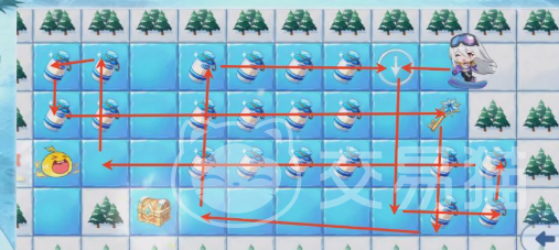 雪场活动不仅提供鲜牛奶与铃铛两类基础道具,还能逐步解锁后续奖励节点,整体节奏友好、投入产出比高。但需特别注意:角色在无遮挡冰面上会持续滑行,直至碰撞障碍物(如树木)才停止。因此每一步移动前都应预判终点位置。初期关卡地形规整,推荐采用“右→下→左→上”顺时针路径,可完整拾取全部奶瓶,并精准停驻终点,新手一次通过率极高。随着关卡递进,地图扩展为标准网格结构,策略调整为“先右后左、由外向内”——优先清理右侧所有奶瓶,再开启宝箱;随后转向左侧区域,切忌直冲终点,避免遗漏关键目标。