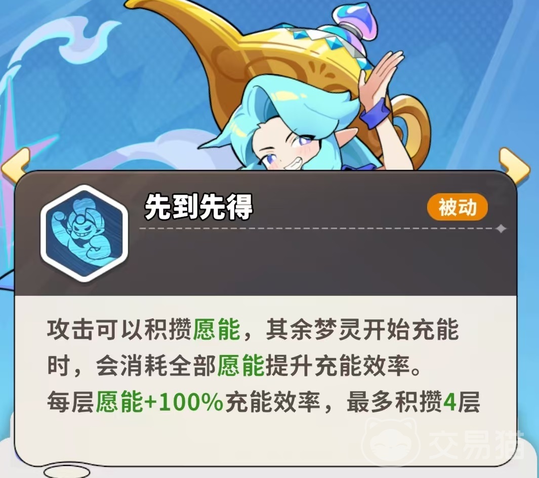 主动技能“灯灵出击”可投射迷雾区域,触发多段范围伤害;而被动“先到先得”则构建了独特的资源联动体系——神灯王子通过普通攻击积攒“愿能”,当其他梦灵进入充能阶段时,将自动消耗其全部愿能,每层愿能提升100%充能效率,上限为四层(即最高400%效率增幅)。这一机制显著压缩技能真空期,使整支队伍输出链更紧凑、更连贯。