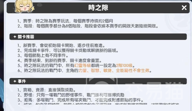“时之隙”为赛季制独立副本,每赛季持续两个月,共划分为8个阶段,随开服天数逐步解锁。赛季开启后,玩家需从初始关卡重新挑战,完成各类事件以获取资源奖励——包括宝箱类资源事件与野怪遭遇事件等。需特别注意:赛季结束后,所有关卡进度将被重置;且该玩法中所有幻灵等级统一设定为2100级,确保公平竞技与策略比拼的基础一致性。