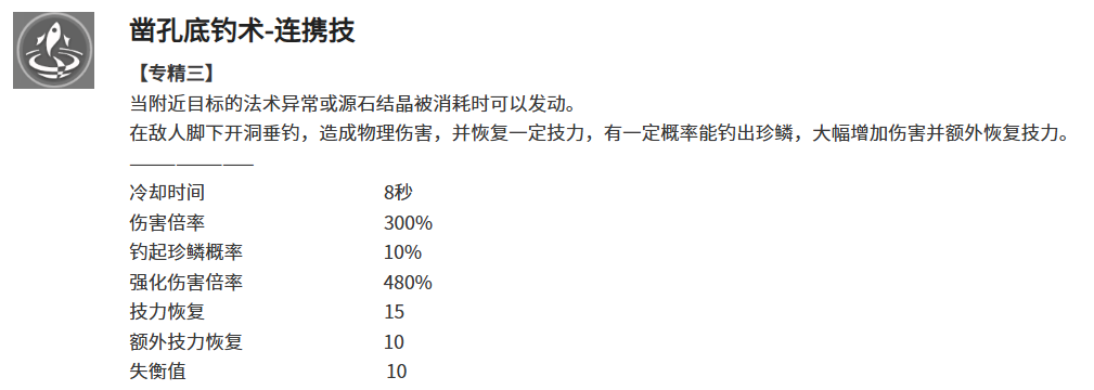 连携技【凿孔底钓术】拥有8秒冷却时间,触发条件为附近存在法术异常或源石结晶被消耗。基础倍率为300%,并有10%概率触发“珍鳞”效果,使伤害提升至480%,同时额外回复10点技力(叠加基础15点,单次最高返还25点)。尽管概率机制存在随机性,但在短CD与高频触发环境下,珍鳞实际出现频率趋于稳定,尤其在搭配频繁施加/清除法术异常的队友时,可显著强化技力续航能力。