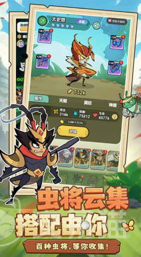 虽以放置为核心机制,但策略深度不容忽视。核心玩法围绕昆虫化武将(虫将)的阵容构建展开,涵盖兵种相克逻辑、前中后排布阵逻辑及羁绊系统联动。开局即赠三大特色角色:铁甲蟋蟀张飞(高生存,前排承伤)、赤焰螳螂关羽(均衡输出,开荒主力)、幻影蝶诸葛亮(技能协同型,适配战术流)。合理配置站位、激活羁绊加成、组合连携技,平民玩家亦能凭借思路打出高爆发表现。多种成型流派可供探索,逐步打磨专属作战体系。