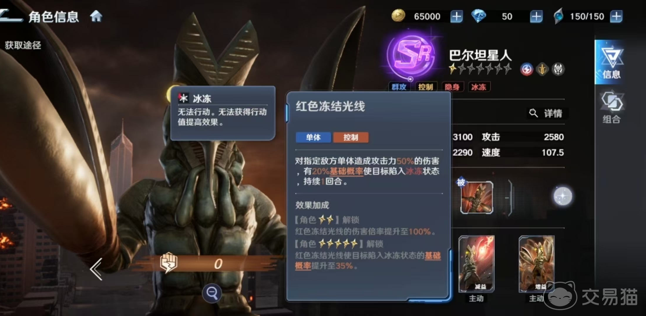 其被动技能“隐匿庇护”生效时,我方所有处于隐身状态的单位所受伤害降低15%;必杀技“分身突袭”对敌方全体造成120%攻击力的伤害,升星后倍率提升至160%,若目标当前处于控制状态,则额外触发增伤效果;主动技能“红色冻结光线”针对单体目标施加伤害,并有概率令其陷入冰冻,最高触发概率随星级提升至35%,冰冻状态下目标将跳过一回合行动;专属技能“战术隐身”可指定一名友方单位,使巴尔坦星人与其共同进入隐身状态,持续两回合,隐身期间无法被敌方选中,升星后进一步降低隐身单位所受伤害。