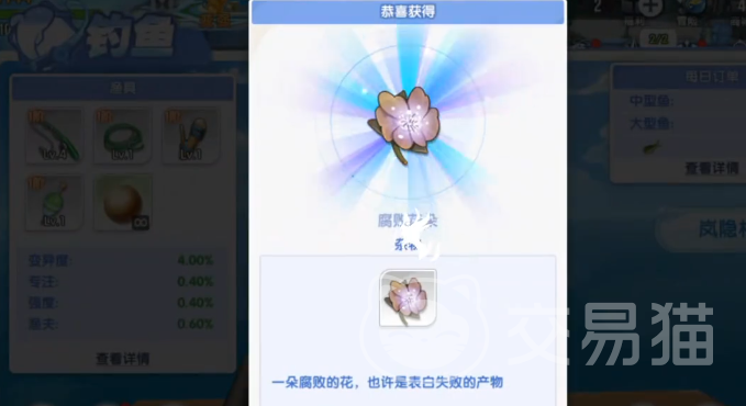 后续尝试中,陆续出现腐败的花、空竿等低收益情况,进度条持续累积却无实质收获,易引发挫败感。究其原因,在于钓鱼品质受双重核心参数调控:专注度决定基础命中率与目标类型分布,变异度则直接影响稀有生物(如巨岩海龟、绿胖头鲑)的触发概率。当前4%变异度恰位于部分水生生物掉落条件的临界点,小幅提升即可显著改善产出结构。