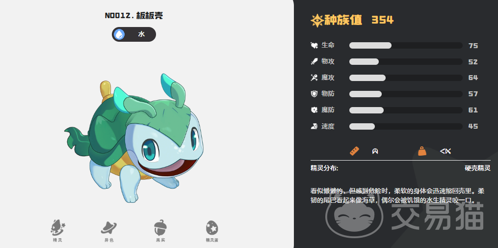 板板壳为水系防御向精灵,外形敦厚稳健。特性“坚甲”使其每次使用防御类技能时,永久提升2点防御值(可多次叠加)。该成长机制契合护盾流、反伤流及团队保护型阵容,配合高耐久基础与减耗技能,可有效延长站场时间并增强队友生存能力。