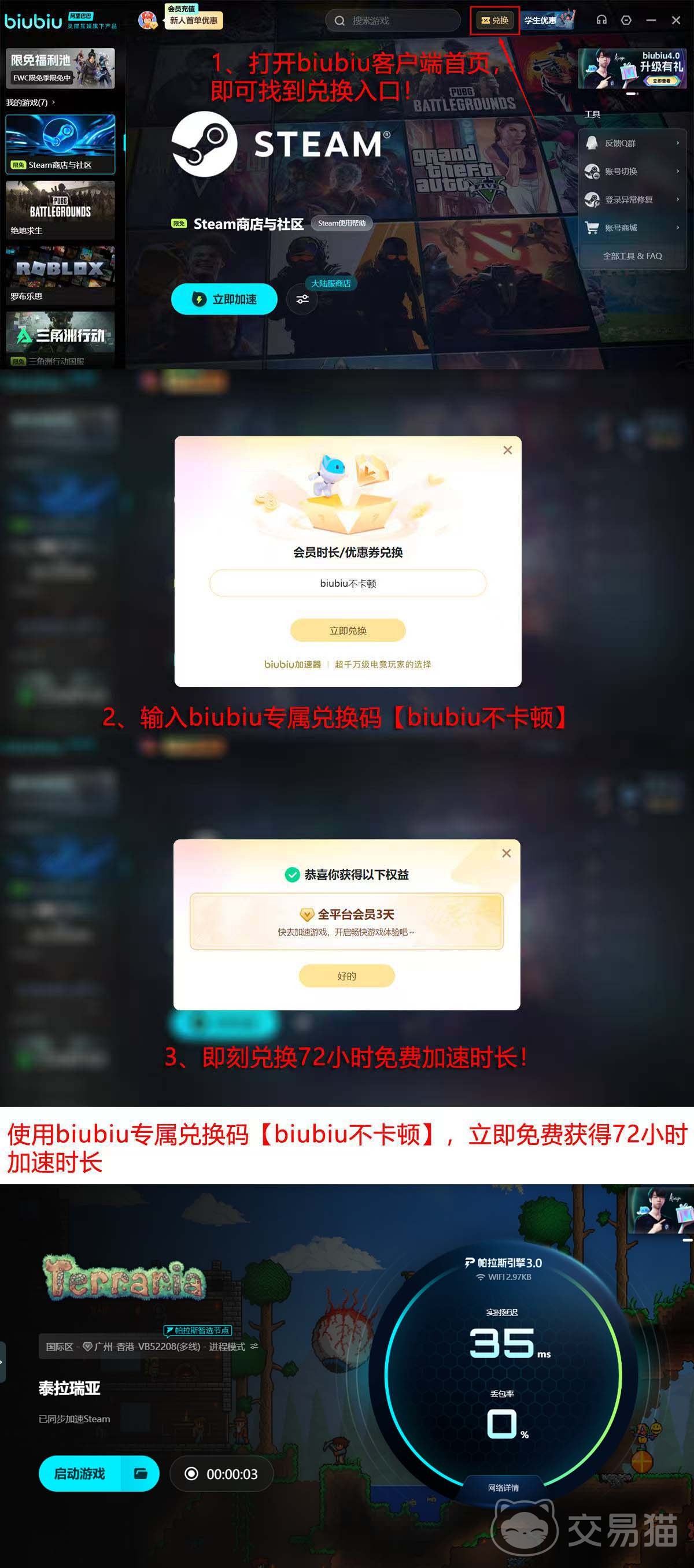 用户可通过注册获取初始体验时长:新账号开通即获24小时免费使用权;登录后进入首页点击“兑换”入口,输入口令【biubiu不卡顿】,额外领取72小时,两项时长独立计算,总计可达96小时。该权限覆盖游戏下载、版本更新、联机对战等全部核心环节,可有效规避高延迟、掉线、加载失败等常见问题。