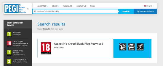 PEGI是一个由欧洲互动软件协会于2003年成立的组织,旨在为欧洲发行的电子游戏提供年龄分级和内容评估。截至发稿前,《刺客信条:黑旗 重制版》目前在该网站上查询到的结果为18分级。