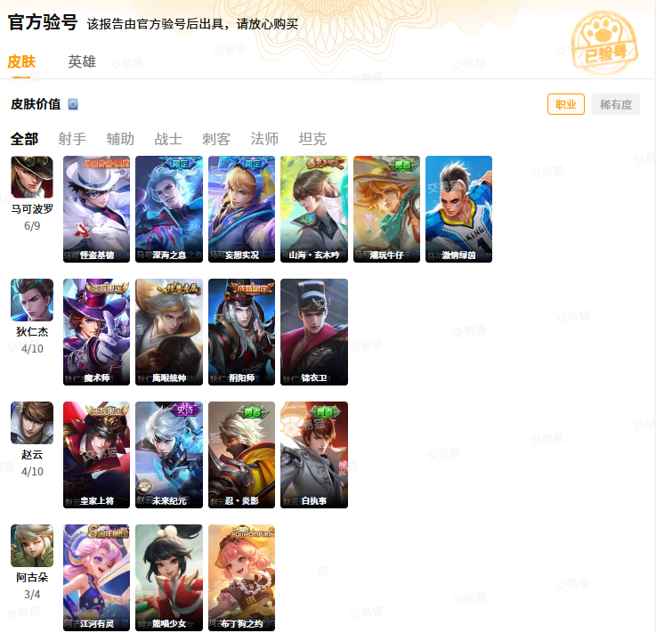 从图中可以看到,给大家提供的账号还是比较丰富的,各种皮肤都有,除了VIP等级要求之外,小伙伴们若是有心仪的皮肤也可以输入进行检索,不少都是当下没有的限定或者限时皮肤。