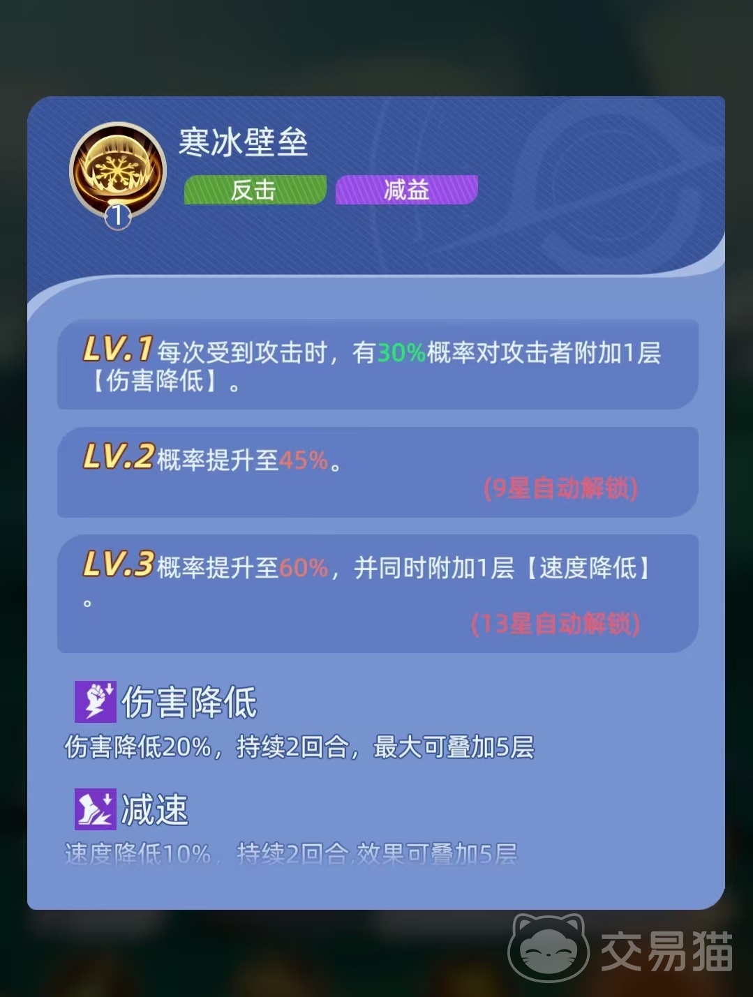 二技能具备被动回血特性:每回合开始时,若自身当前生命值低于最大生命值的50%,则恢复相当于最大生命值10%的生命值。该机制显著强化其续航能力,使其在辅助角色减员或治疗压力骤增时仍能维持前排站位稳定性。三技能“寒冰壁垒”为反制型减益技:每次受到普攻或技能攻击时,均有概率对攻击者施加1层“伤害降低”效果;技能等级提升后,额外附加1层“速度降低”效果。两类减益均可叠加至最高5层,持续压制敌方输出效率与出手节奏,为我方创造多轮先手优势。