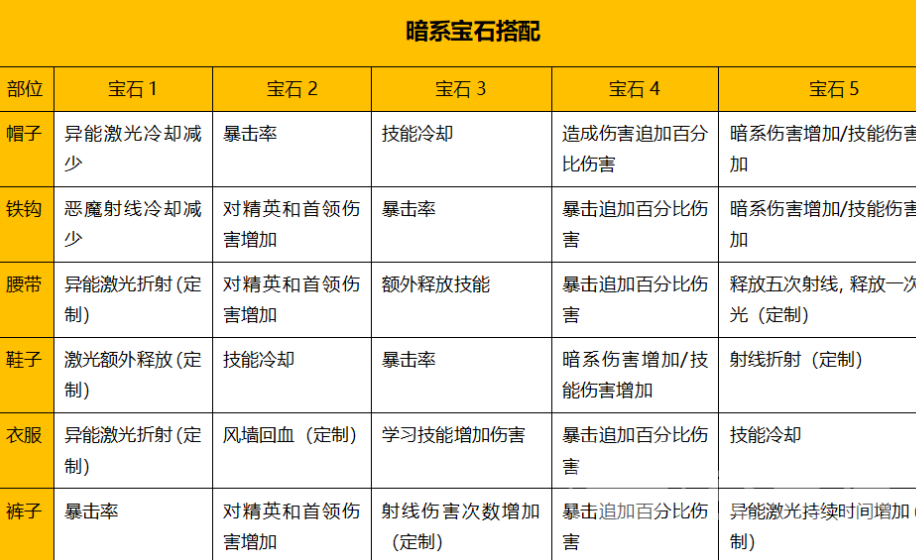 暗系构建逻辑迥异,全程围绕【异能激光】与【恶魔射线】双技能循环展开。头部与护腕须优先嵌入【异能激光冷却减少】和【恶魔射线冷却减少】,直接压缩双技能真空期,实现高频技能覆盖。腰带与足部侧重定制词条:【异能激光折射】扩大攻击范围,【激光额外释放】提升单次循环内激光命中次数;其中腰带专属联动词条【每释放五次射线,自动触发一次异能激光】,可形成稳定的爆发节奏。下装部位重点筛选【射线伤害次数增加】与【异能激光持续时间增加】,前者延长射线总输出时长,后者强化激光挂dot覆盖率,共同推高单位时间伤害总量。