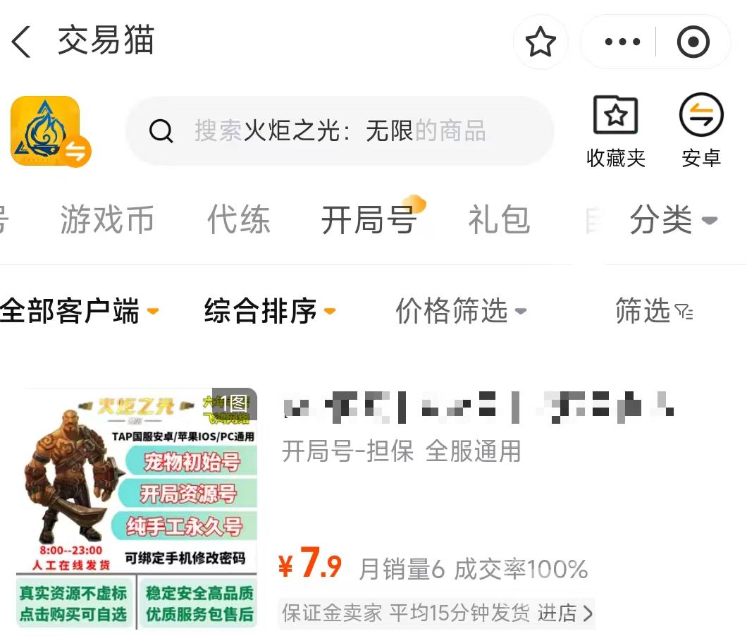 扫码下载APP 下载 点击下载APP火炬之光无限多数账号的内容是完全不一样的,毕竟每个职业所要求的毕业练度以及装备都存在巨大的差别,很多玩家在购买的时候会担心账号的内容是否属实,这个在是不需要担心的,因为该平台提供的账号都经过严格的审核,一旦账号出现虚假问题,平台都会进行上架的,而且还会赠送一个安心购的服务权益,如果后续账号出现问题的话,官方都会给予赔付,服务态度是很优秀的,而且平台实现全品类游戏全覆盖,涵盖6000余款各类游戏,100万余件商品持续在线上架,累计为超7000万玩家提供优质服务,想要使用平台,安卓用户能通过上方按钮下载,而ios用户则可以直接到官网使用哦。
