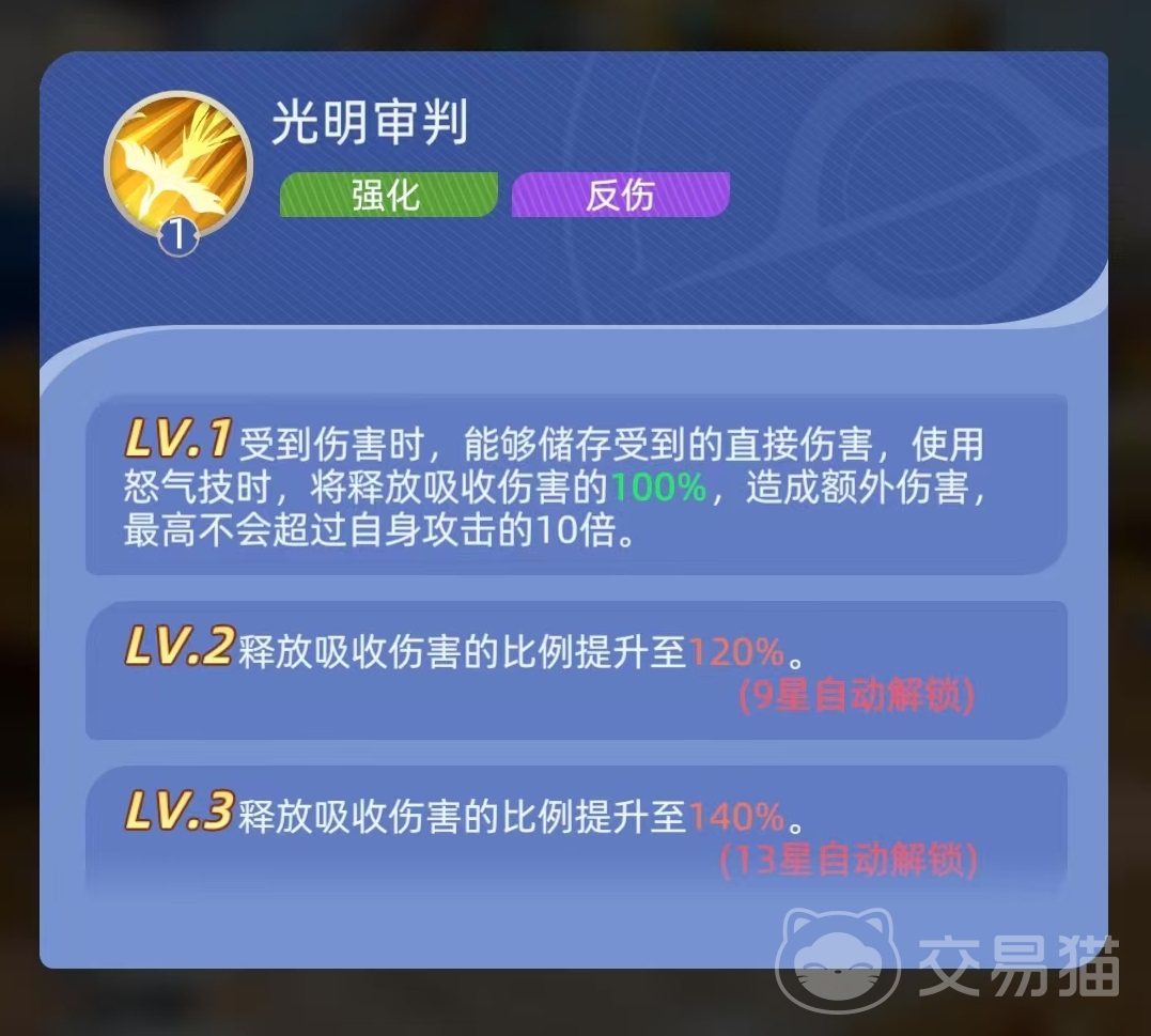 三技能为反伤蓄能机制:每次受到伤害均可积累一定比例的“怒意值”,当释放大招(即怒气技能)时,将此前储存的所有反伤量一次性爆发,转化为对敌方全体或指定目标的额外真实伤害。这一设定打破了传统坦克纯承伤的职能边界,赋予其可观的战术反击输出潜力,实现攻防一体的前排价值再定义。