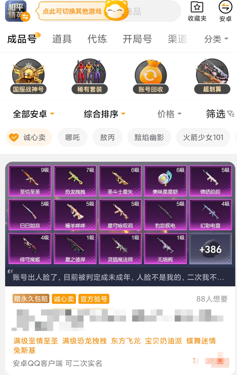在当中,足足收录了6000多款游戏,并上架了百万个游戏账号,光是和平精英的在售账号就有几十万个,这些账号还有独立的专区展示可供买家方便筛选,在专区当中,你可以根据账号内所拥有的皮肤名字,或是价格进行精细化筛选,以确保吻合你最想要的账号,并以心仪的价格购买下来。