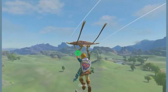 科技媒体The Verge记者Jay Peters获得了抢先体验资格,并成功生成了一系列“任天堂风格”的游戏场景。其中一幕明显模仿了《塞尔达传说:旷野之息》——画面中一个神似林克的角色在海拉尔风格的地图中奔跑,并在跳下悬崖时精准展开了滑翔翼,相似度极高。