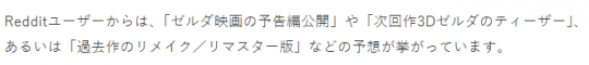 ·玩家太乱的几个策划包括“公开塞尔达电影的新预告?”、“全新3D塞尔达大作的预告?”、“经典塞尔达游戏的重制版?”等等。
