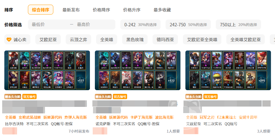 综合来看,是当前LOL账号交易场景中具备高适配性的专业平台。其依托完善的风控机制、规模化账号池及自动化履约流程,显著降低交易风险与时间成本。合理定价的前提下,账号平均售出周期较短,且全程无需卖家持续盯守,真正实现“一键上架、安心交付”的服务体验。