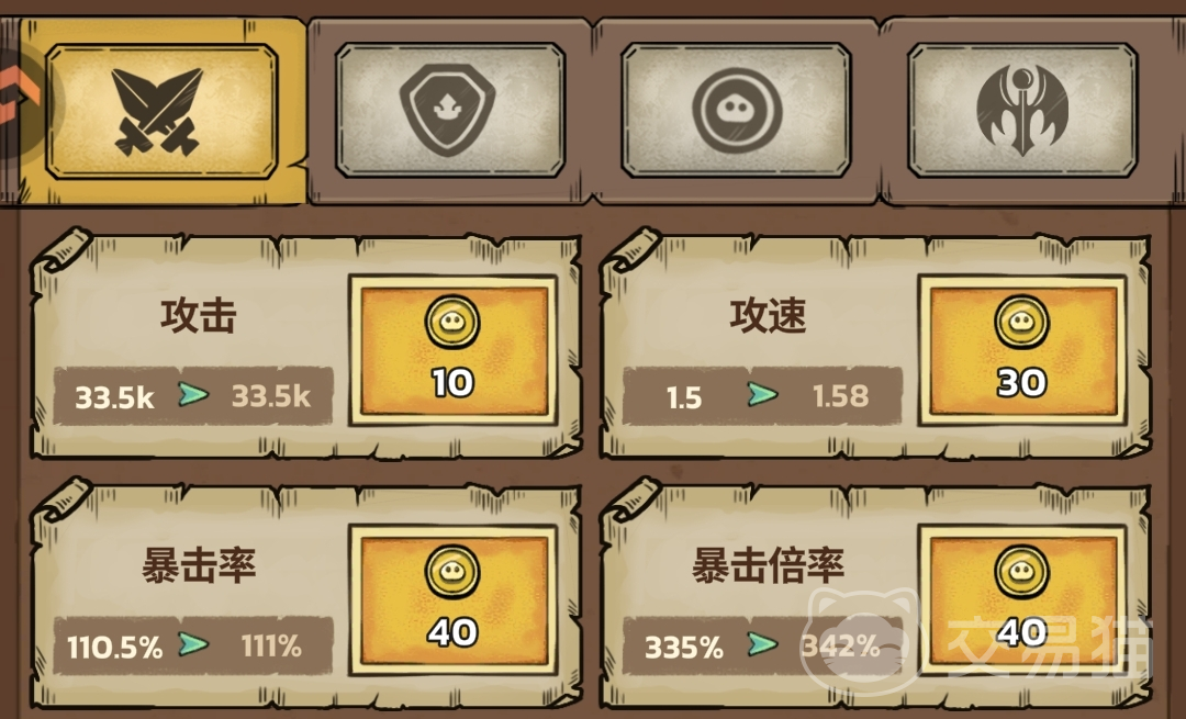 首日金币优先分配至攻击、攻速、攻击范围(400金币解锁)、减速概率(600金币解锁)及双重攻击几率(2000金币解锁)。攻速目标为3.0,攻击范围目标为20;攻击属性仅需满足两击击杀普通敌人即可暂停;后续资源集中补满双重攻击几率与减速概率,再依次强化攻速、攻击范围与攻击数值。其余天赋暂不投入。