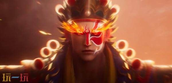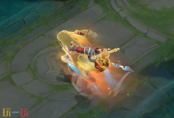 一技能:盘古高高跃起,以英歌动作重踏砸地,地面印刻脸谱图腾;能量臂状态下,动作融合英歌舞步向前飞踢,带出流火残影。